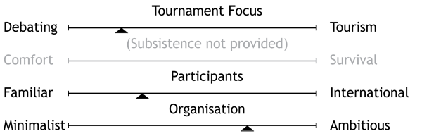 For a relatively small tournament 5 rounds and 7 minute speeches were very ambitious. The international focus of CEU was the reason, why there were many international speakers involved. There was no reg-fee and crash provided for those who needed it. Since it would be unfair to compare a no-reg-fee tournament with the more expensive ones, the subsistence-factor is left out this time. The organisers have always shown us the right places to go to, so we were very satisfied with their performance.
