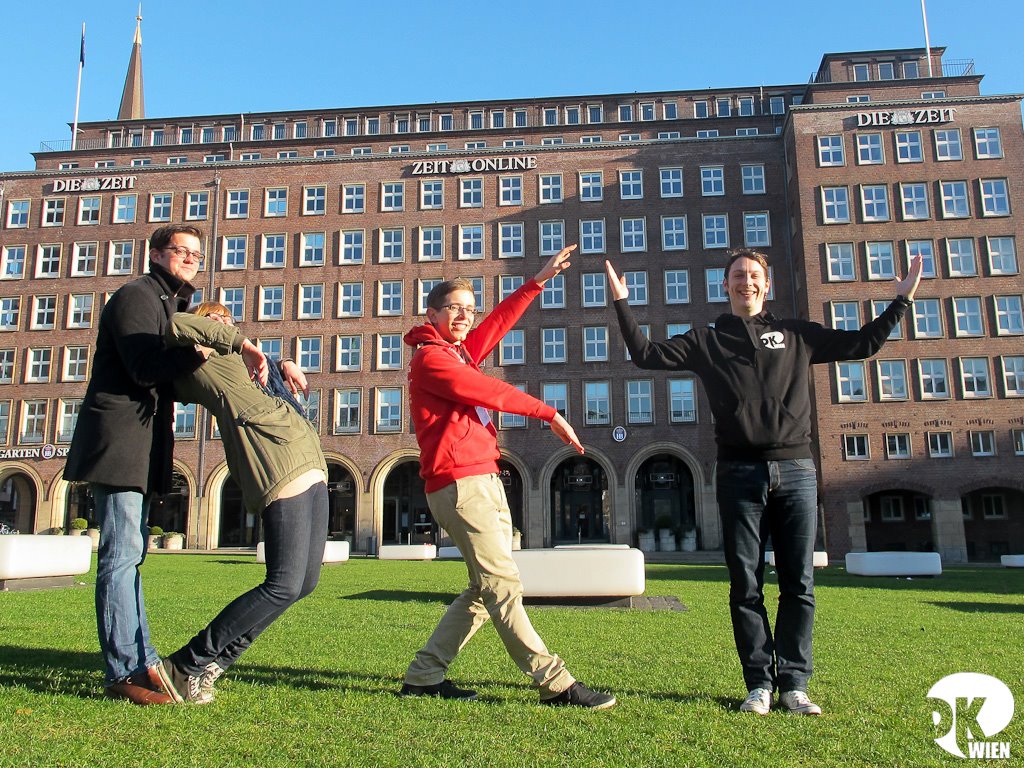 Voller Vorfreude auf ein tolles Turnier machten sich ¾ der Wiener Delegation am Freitag in aller Früh auf den Weg nach Hamburg. Empfangen von einem wilden nordseekalten Schneetreiben, dem wir auch mit wasserdurchlässigen Schuhe trotzten, machten wir uns  gleich auf den Weg, die Hansestadt an der Elbe zu erkunden. Vom Hafen und der Speicherstadt ging es in der Hauptkirche St. Petri über 544 Stufen bis zur Turmspitze auf 123 Meter Höhe, von wo wir einen wunderschönen Aus- und Rundblick über die Stadt genießen konnten.  Danach machten wir uns wieder in Richtung Hotel auf, um mit Philipp unser Wiener Team zu komplettieren. Zum Aufwärmen debattierten wir in der ersten Runde gegen die späteren Finalisten aus Heidelberg und verloren diese Übung mit zwar vielen Punkten, aber dennoch häuserhoch. Zum Ausklang des ersten Abends ging es danach zu Bier und Billard in ein Pub. Bestens ausgeschlafen freuten wir uns am folgenden Turniertag auf die nächsten Debatten über spannende Fragen. Nur ein Thema ließ uns an unseren Kenntnissen zweifeln – Was geschah denn am 9. November 1989 – oder doch 1990 – wirklich? In Vertrauen auf unser historisches Wissen versuchten wir „Wiener Gschichtldrucker“ beinahe, unseren Streitpartnern und der Jury ein „Gschichtl“ aufzutischen, mussten uns aber der Präzision deutscher Faktenkenntnis beugen. Mit raschem Einfallsreichtum triumphierten wir dennoch in dieser Runde. Nach der dritten Runde, die wir als freie Redner bestritten, freuten wir uns sehr darüber, am Nachmittag weiterhin im Team reden zu können. Nun schon als Team eingespielt, waren die vierte und die fünfte Runde ein Hochgenuss des gemeinsamen Debattierens. Nach einer gewonnenen vierten Runde stellten wir in der fünften Runde einen gewagten Antrag. Wir forderten, alle Prothesen und technischen Hilfsmittel bei sportlichen Wettkämpfen zu erlauben. Dass wir in der letzten Rede um eins vor zwölf den amerikanischen Präsidenten zu Hilfe riefen, der „ja auch schwarz“ ist, konnten nicht verhindern, dass diesmal die Opposition gewann.